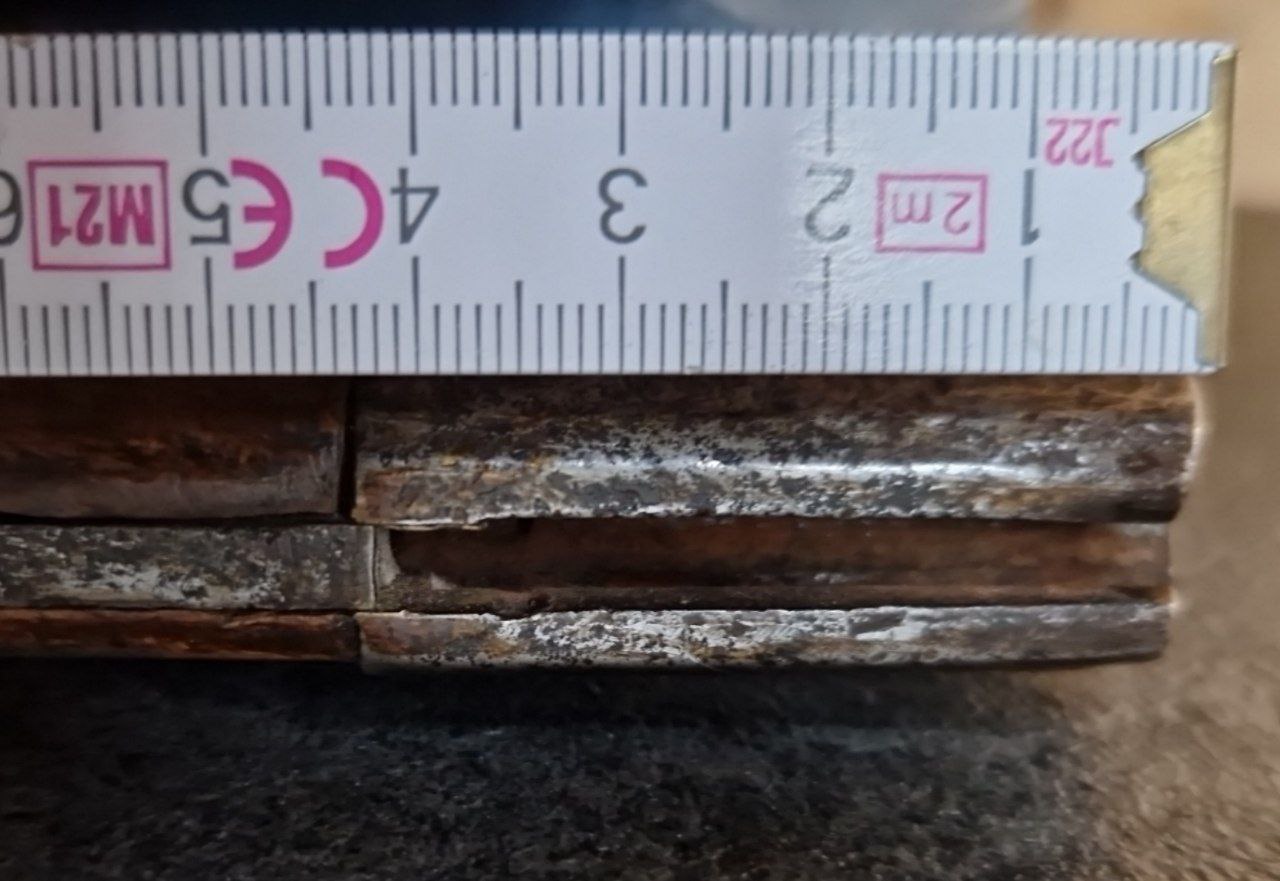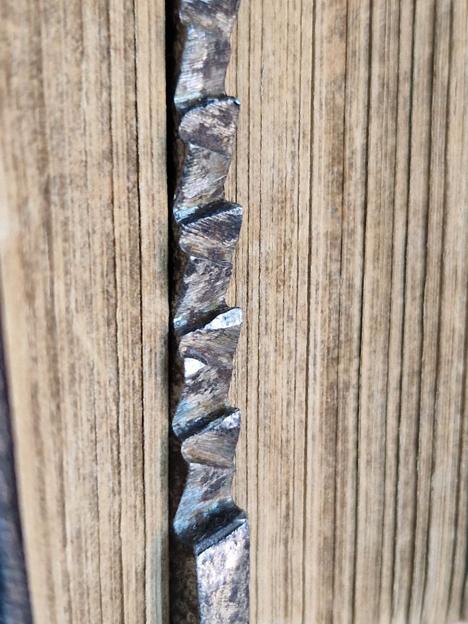 Ich habe entsprechende Fotos angefügt: man sieht deutlich, wie man eine gelblich-braune Lasur auf die Sägezähne gestrichen hat und da kommt halt der Verdacht auf, dass man möglicherweise einen "frischen" Schnitt in den Stahl auf alt trimmen wollte? Allerdings ehen die Zähne ziemlich abgenutzt aus - was aber jeder "vernünftige" Fälscher wohl auch tun würde.