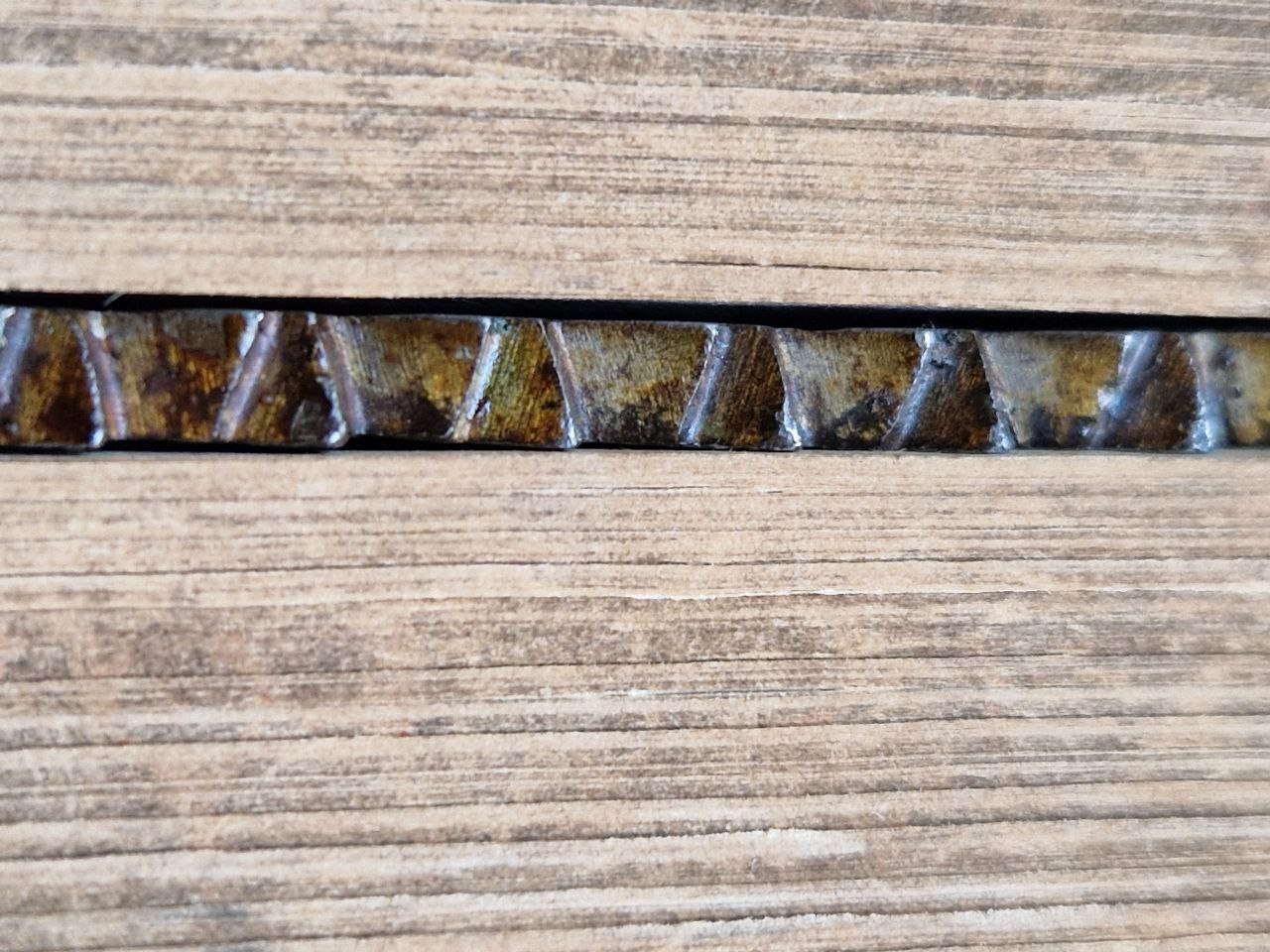 Ich habe entsprechende Fotos angefügt: man sieht deutlich, wie man eine gelblich-braune Lasur auf die Sägezähne gestrichen hat und da kommt halt der Verdacht auf, dass man möglicherweise einen "frischen" Schnitt in den Stahl auf alt trimmen wollte? Allerdings ehen die Zähne ziemlich abgenutzt aus - was aber jeder "vernünftige" Fälscher wohl auch tun würde.