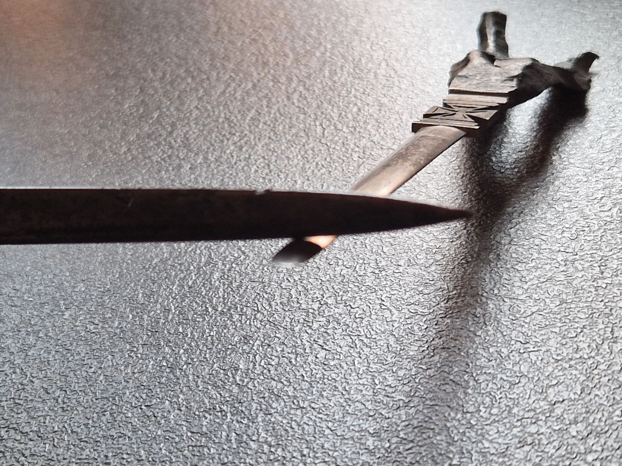 Nun zum Skurrilen: Die Klingenspitze des Stückes ist magnetisch. Das hat mich so verdutzt, dass ich zwei Beispielfotos mit einem aus einen Granatsplitter gefertigten Brieföffner gefertigt habe.
