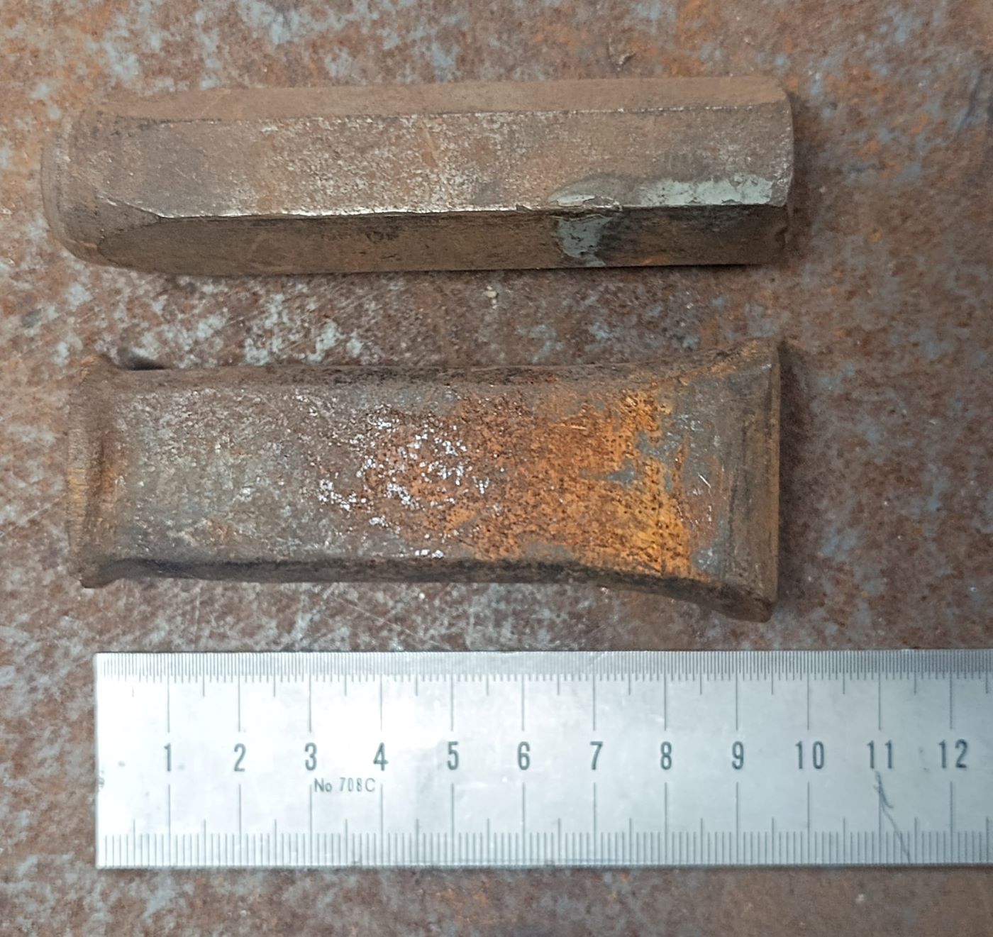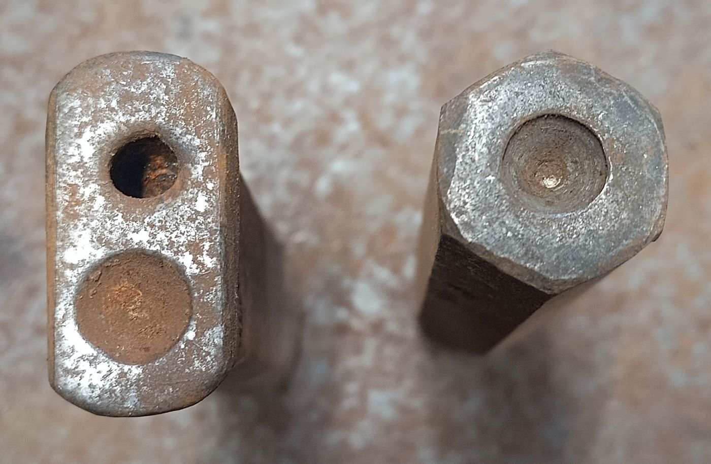 Diese beiden Teile habe ich letztes Wochenende beim Trödler gefunden. Es handelt sich um Werkzeuge zum Vernieten. Wobei das rechteckige Teil eine Kombination von Nietenzieher (zum "Anziehen"/Andrücken der Bleche an den schon vorhandenen Nietkopf) und Vernieter ist.