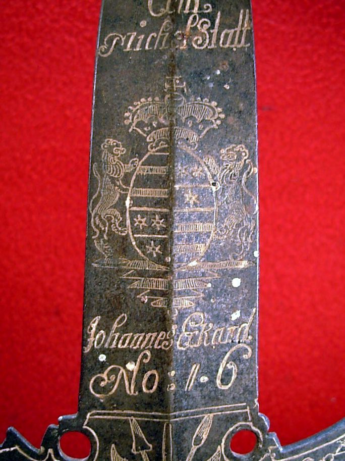 Die Auflösung des auf beiden Klinghenseiten eingravierten Wappens unter Krone war langwierig, doch ich denke, ich konnte zumindest dieses Rätsel lösen.
