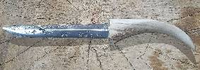 Bauernwehr-Jagdsäbel-Hybriden blieb die schlecht erhaltene Klingenspitze übrig. Irgendwo hatte irgendwer die Idee, dass man aus der stark narbigen Klingenspitze noch ein Messer machen könnte.