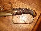 Hier ein Stück mit einem ähnlichen Griff,aber verheiratet mit einer älteren Klinge.Dieser kurze Infantriesäbel weißt keinerlei Marken od.Stempel auf.Mitteleisen wurden gekürzt (beidseitig)um die Klinge problemlos in die Scheide zu bekommen.Diese Mariage wurde schon vor langer Zeit durchgeführt