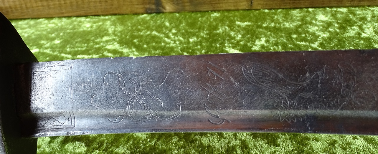 Auf der rechten Klingenseite sind Ornamente, auf der linken ein Osmanenkopf und Zahlen.