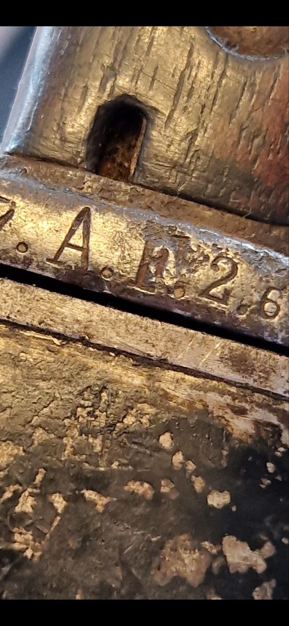 Mit der Lupe hat man in der Regel nur eine Chance bei den Aushilfsseitengewehren mit Eisengriff. In Verbindung mit Korrosion und der Originalfarbe.