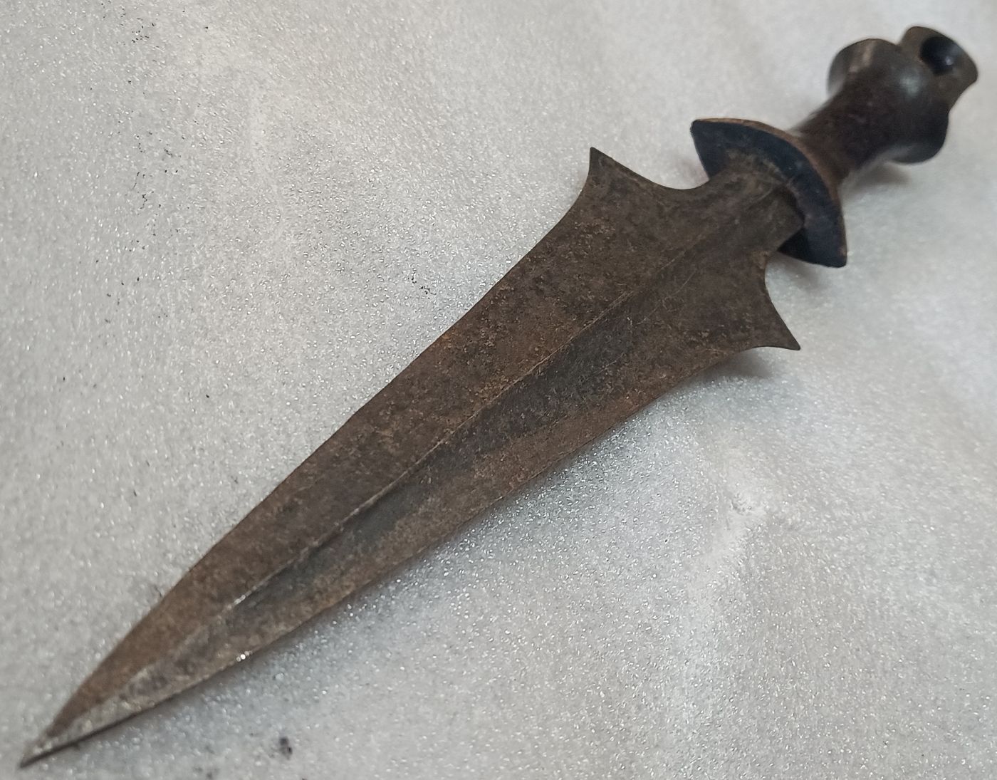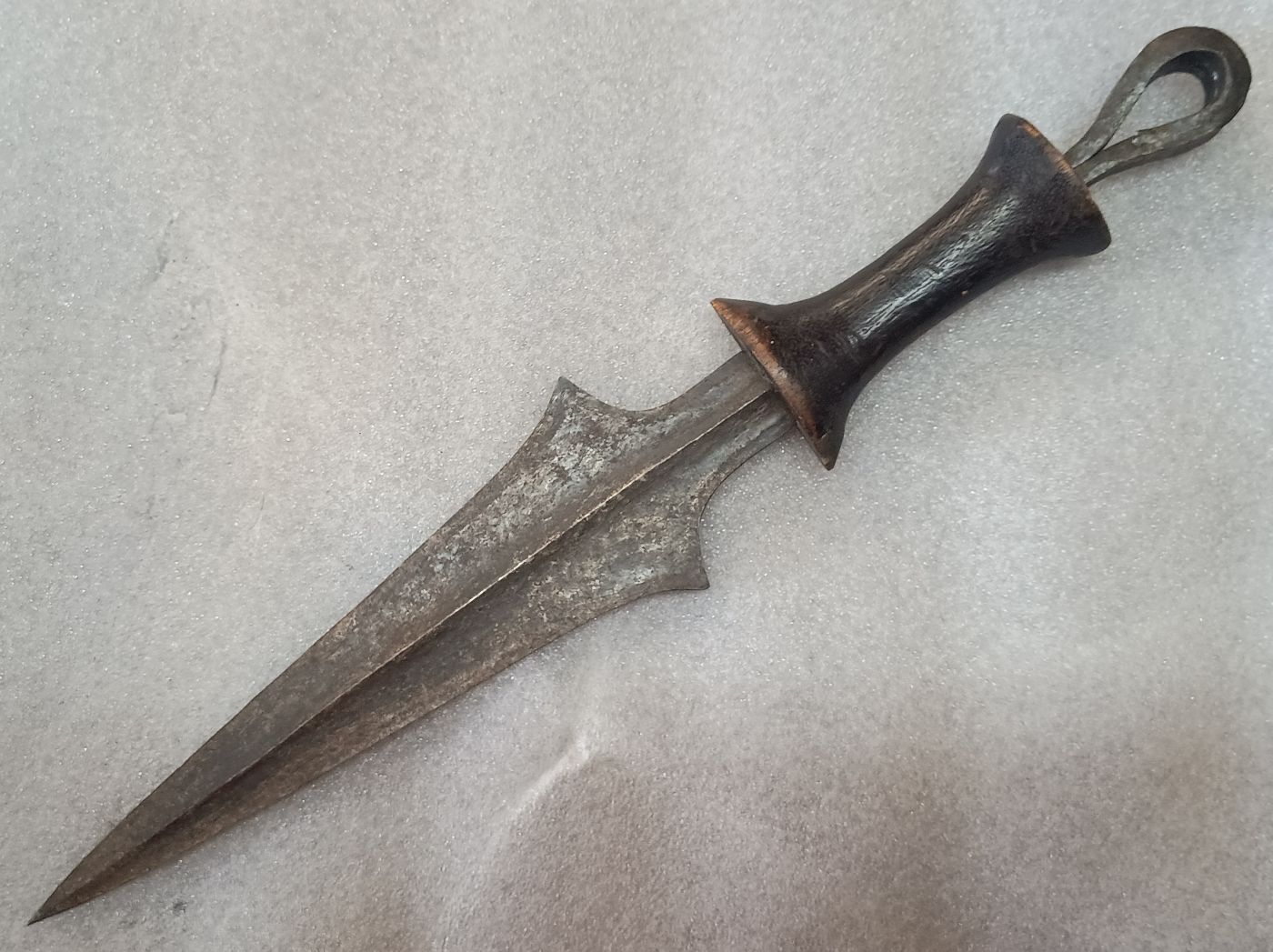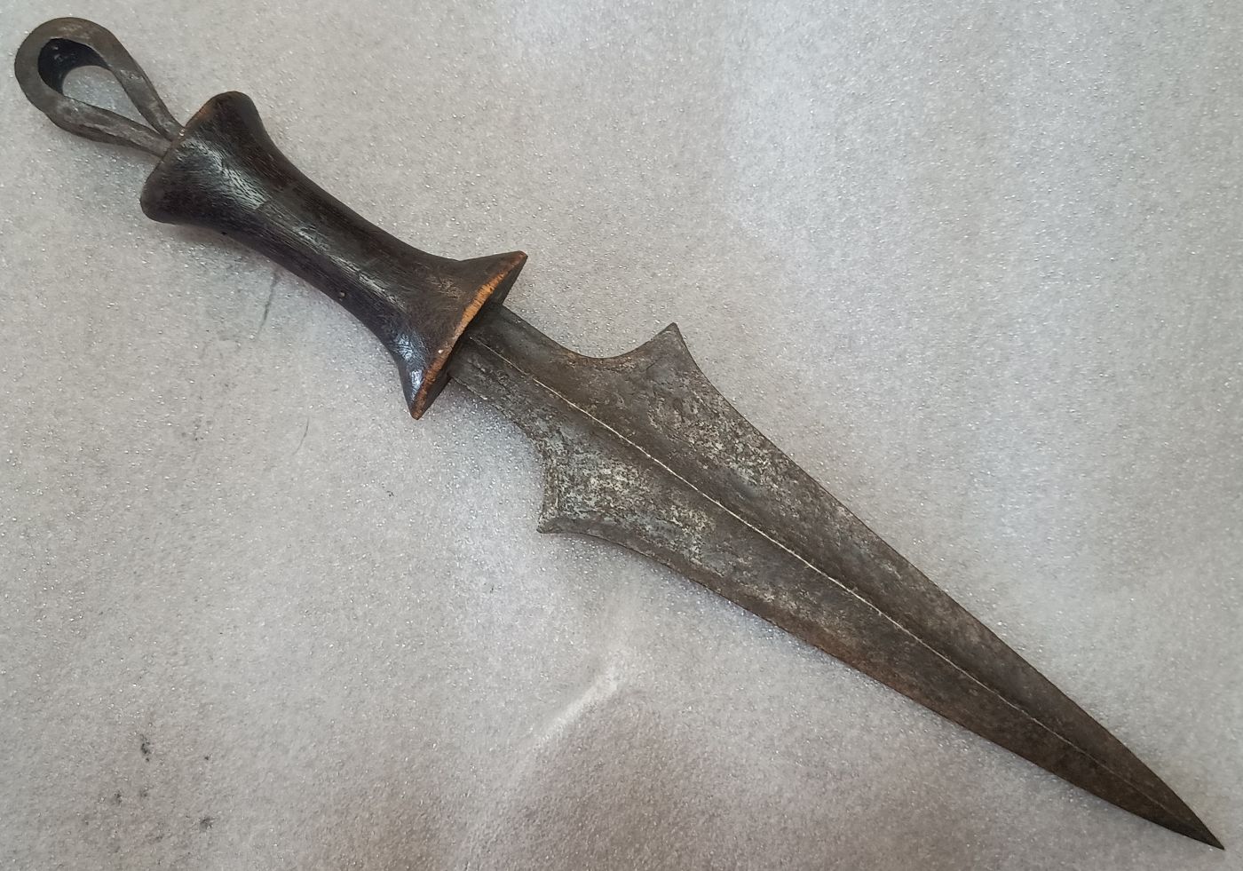 Die stammesmäßige Zuordnung von mir entspricht meinen oberflächlichen Rechercheergebnissen. Neben Tetela kommen wahrscheinlich noch Kusu und Sungu in die nähere Auswahl. Es gibt fließende Übergänge. Die Dolchmesser der Tetela können spitze Knäufe haben oder auch schlaufenförmige, wie im vorliegenden Fall. Der Griff ist aus Holz.