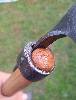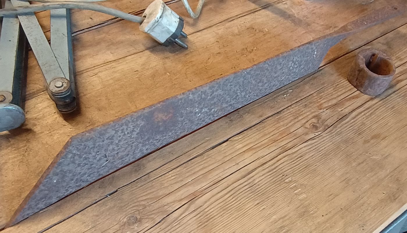 Ich muss zugeben, dass ich beim Kauf einen schönen kräftigen Sax vor meinem geistigen Auge sah. Je mehr ich mir dieses schöne Teil aber betrachtete, täte mir das Herz bluten, wenn ich es umgestalten würde. Und da ich schon einige Saxe habe, hab ich mir einen alten, vorne abgebrochenen Schippenstiel aus Esche mit interessanter Kurvenform genommen und ging frisch ans Werk.