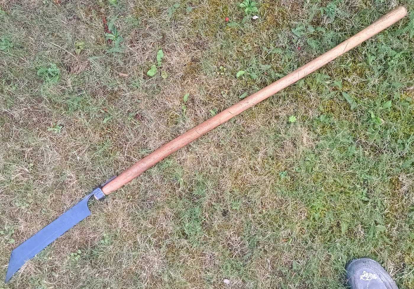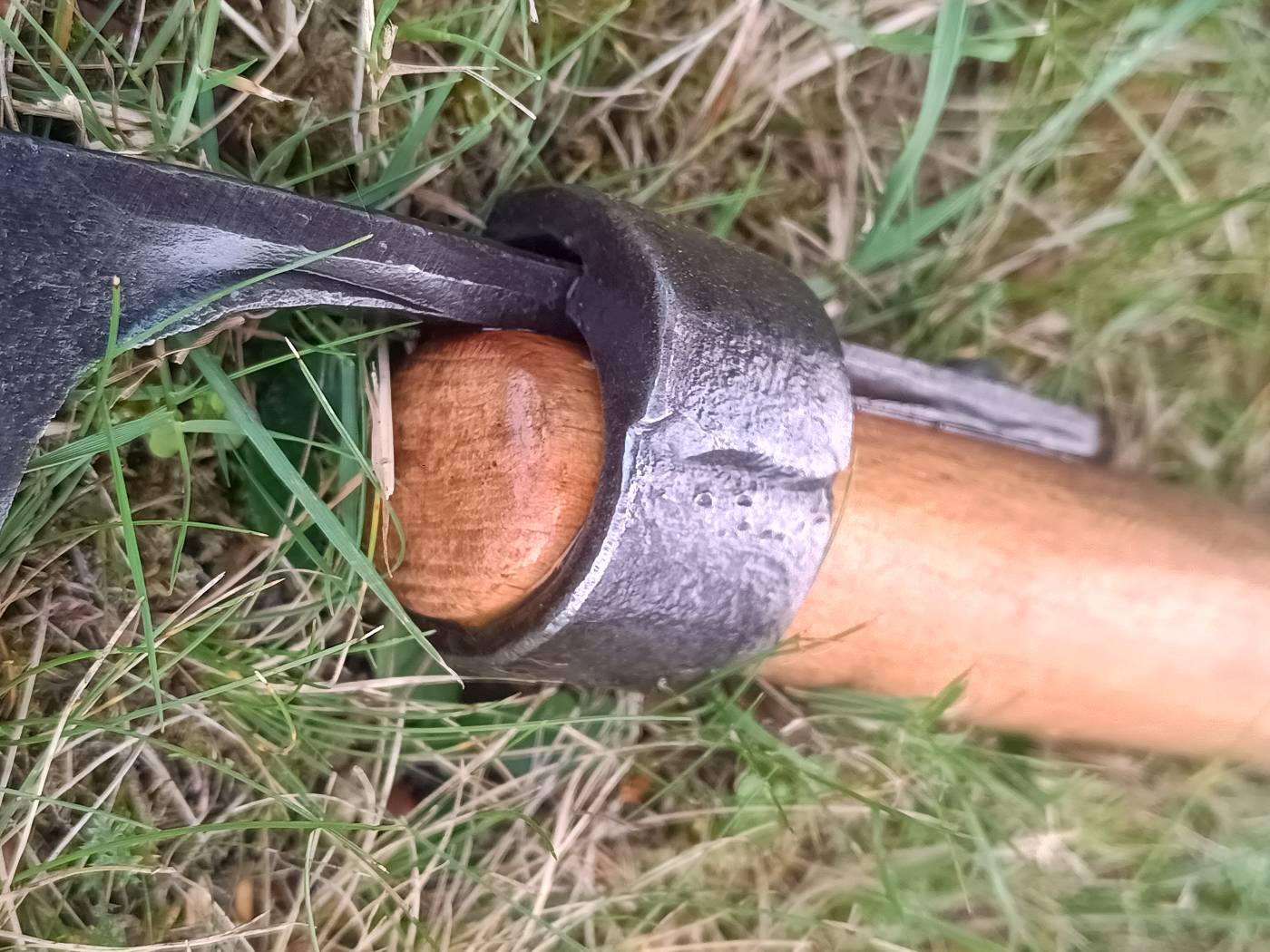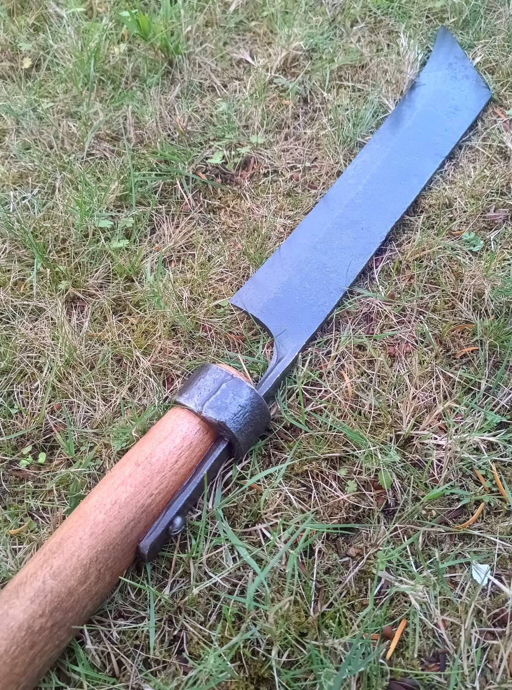 Letzten Sonntag habe ich dieses "Hackmesser" auf dem Flohmarkt erstanden. Aufgrund der zur Klinge quer liegenden Stielbefestigung