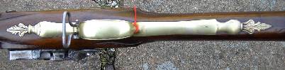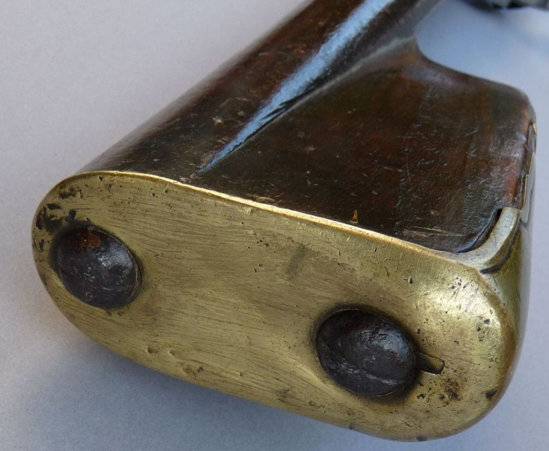 [I]Fast gerader Nussbaumvollschaft mit ausgeprägtem Kuhfuß Kolben und Messingbeschlägen, diese bestehend aus vier doppelt kannelierten Ladestockröhrchen, einem halben Mündungsband, einteiligem Abzugsbügel mit vorderer und hinterer Verlängerung, Kolbenkappe mit einfach verschraubter, oberer Verlängerung und zwei großen Schrauben an der Unterseite, bekröntem Daumenblech mit gegeneinanderstehenden Monogramm „F“ für Markgraf Friedrich III. sowie Schlossgegenblech für zwei Schrauben. Trageriemenösen am Abzugsbügel vorne und am Vorderschaft. Auf der gesamten Länge runder Lauf mit Kannelierung am Pulversack und Bajonettwarze an der Laufunterseite kurz hinter der Mündung. Steinschloss mit flachem Schlossblech und entsprechendem Schwanenhalshahn. Eiserne Pfanne mit hahnseitigem Feuerschirm ohne Verbindungssteg zum Batterielager. Die Schlagfläche der Batterie nach preußischem Vorbild oben gerade. Eiserner, konischer Ladestock mit Endgewinde und Messingummantelung am Stoß Kopf.„6“ am Schaft links oben, sonst keinerlei sichtbare Marken oder Signaturen.