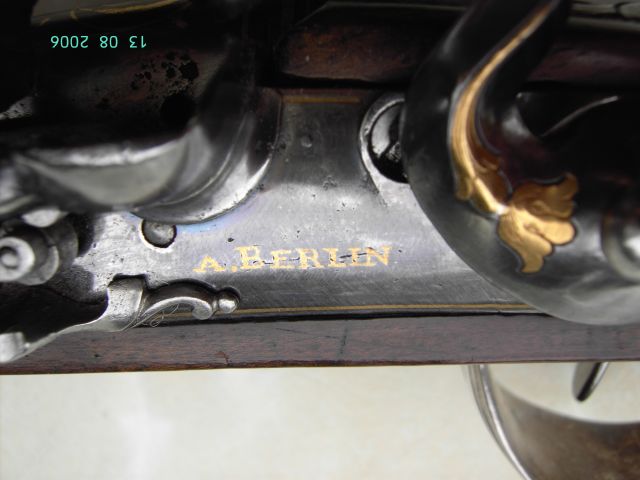 Auf dem rechten Schlossblechen rechts in Gold eingelegt das Herstellersignat“ I.D.V.D.FECHT“, am linken Schloss der Herstellungsort „À BERLIN“.