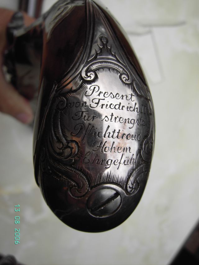 Pflichtreue / Hohem / Ehrgefühl“. Die Kolbenkappe der linken Pistole zeigt die Gravur „Prinz Heinrich / Von Preussen / General des / Inf. Reg. / Nr. 35 / Freiberg 1762“.