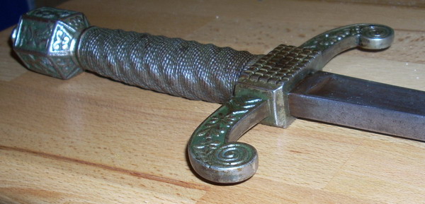 Also ich habe mir das Gefäß jetzt wirklich mal sehr genau angesehen und ich denke nicht, dass das Touristenramsch aus den Südländern ist, der ist im allgemeinen weit weniger schön und vor allem viel schlampiger gemacht. Für Tourischrott sind die Details und der Guss viel zu exakt ausgeführt. Das ist sicherlich echter Historismus und damit nicht mal sooooo verdammenswert. Vielleicht findet sich ja mal auf einem Flohmarkt eine gerade Klinge, die da reinpasst?
