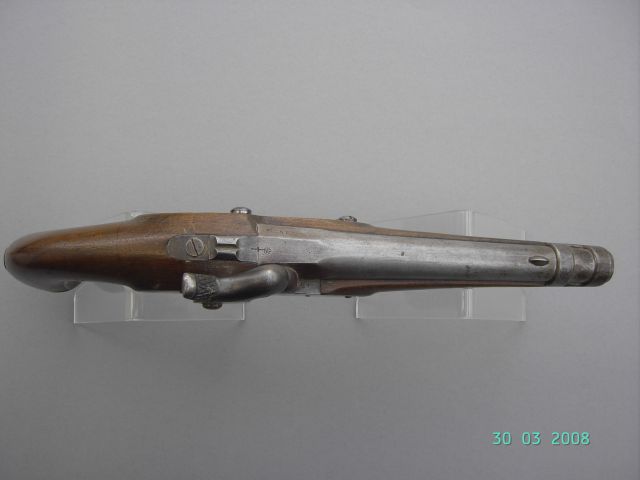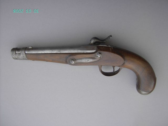 Das bayerische Kriegsministerium stellte 1848 in einem Antrag fest, daß zur Herstellung einer kompletten Reservebewaffnung der Reiterei noch u.a. 13000 Pistolen fehlten, die in ausländischen Fabriken hergestellt werden sollten. 1851 kamen in der Folge 7000 Pistolen M 1843 aus Lüttich. Die ersten 1500 Pistolen dieses Typs waren am 23.10.1851 nach Bayern geliefert worden. Die gelieferten Pistolen zeigten laut noch vorhandener Dokumentation auf dem Schlossblech die Herstellersignatur „LÜTTICH 1851“ und links am Schaft den belgischen Beschussstempel für zivile Waffen „ELG“ im Oval. Bei der Übernahme ließ die Zeughaushauptdirektion in München auf dem Schaft die gekreuzten Schwerter als Zeichen des Staatsbesitzes einschlagen. Die hier vorliegende Pistole zeigt zwar das Herstellersignat, doch die Übernahmemarke der ZHD ist lediglich mit der „Kronen“-Marke auf dem Lauf oben dokumentiert. Darüber hinaus ist auf dem Lauf ein Kontrollstempel „JL“ unter Krone und die am Lauf eingeschlagene Seriennummer zu finden.. Die Hintergründe für die hier vorliegende Andersartigkeit der Stempelung ist nicht bekannt.