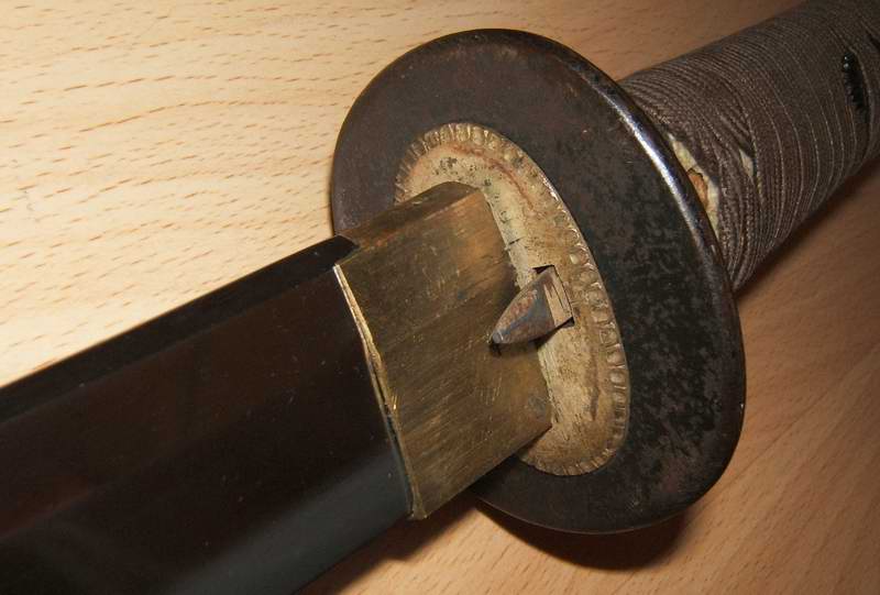 Gehalten wurde die Tsuka (der Griff) an der Angel mit zwei Dübeln (Bambuspflöcke). Das sollte eine Verbesserung der Nutzbarkeit der Waffe darstellen.
