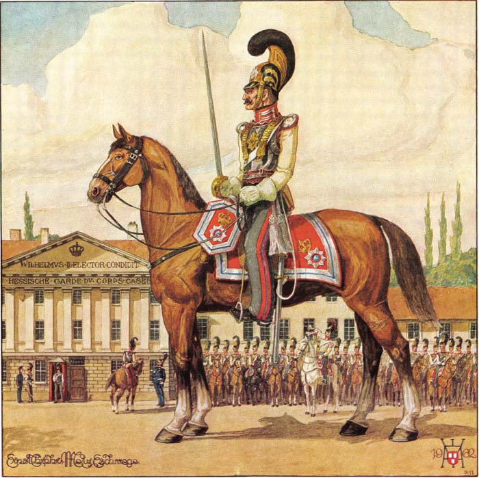 Auch der kleine Kurstaat Hessen konnte mit dieser Elitetruppe glänzen, die der Stolz des verfassungsfeindlichen reaktionären letzten Kurfürsten aus dem alten Hause Brabant war, unter deren oft bewährtem Schutz er sich sicher und überlegen fühlte. Die revoltierenden hessischen "Biedermeier" jener Tage aber haßten diese stolzen und übermütigen Garde-Reiter, seit sie, in der sogen. "ersten Garde-du-Corps-Nacht", am 7. Dezember 1831, mit blankem Pallasch auf wehrlose Passanten eingehauen und Bürgerblut vergossen hatten. - Vielleicht war gerade diese Tatsache ein Grund dafür, daß die hessische Garde du Corps, trotz ihrer jahrhundertelangen Tradition, im Jahr 1866 als einziger Truppenteil, neben dem noch jungen Schützenbataillon, nicht in die preußische Armee übernommen wurde, sondern gänzlicher Auflösung verfiel! (...)"