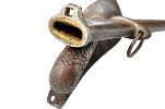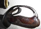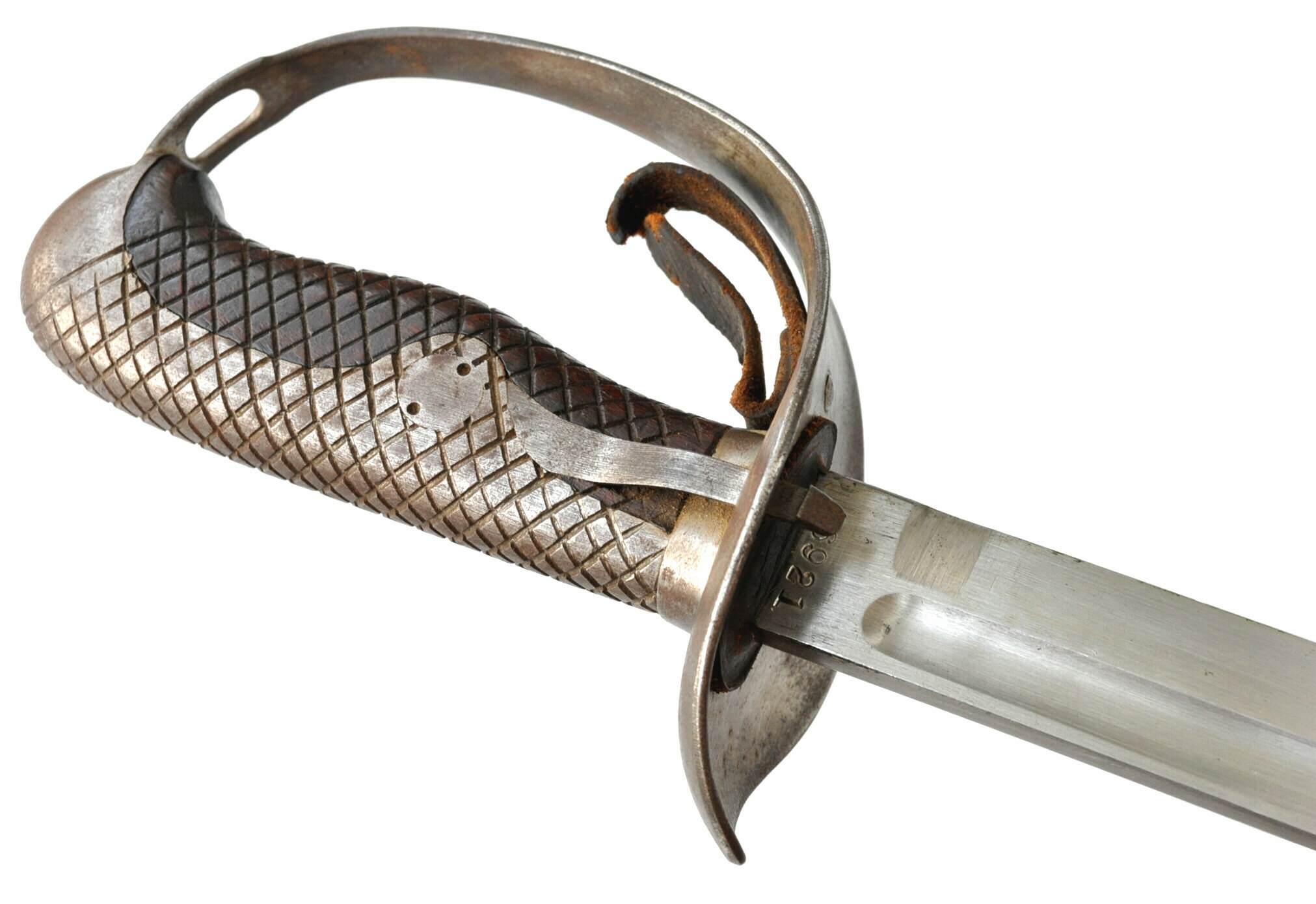 Griffrücken mit Rautenmuster, welches sich auf die Hilze überträgt. Dicke Fingerschlaufe aus Leder, am Griffbügel vernietet.