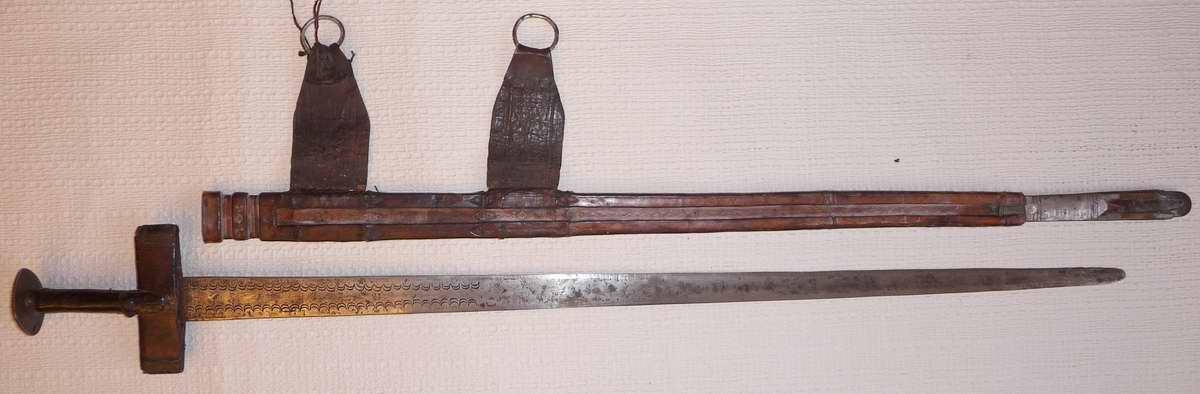 Die dicke Lederscheide hat beidseitig eingepresste Ornamente. An den zwei ledernen Laschen befindet sich je ein Tragering. Das Ortblech wurde, wie der Knauf, aus verschiedenen Blechen zusammengesetzt.