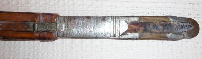 Der metallene Griff ist komplett, inklusive Parierstange, mit Leder bezogen. Der Knauf besteht aus Blechen verschiedenster Materialien. Es findet sich Eisen, Kupfer und Messing darunter. Die Metalle wurden vernietet und/oder verlötet.