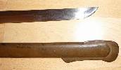 Auch die Scheide wurde grob mit grünbrauner Farbe "getüncht". Überall Nasen im Lack und durchschimmernde schwarze Grundfarbe.