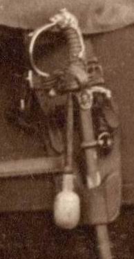 Und hier noch ein älterer Berittener, mit einem Löwenkopfsäbel, auf dessen Parierlappen ebenfalls etwas anderes zu sein scheint, als gekreuzte Waffen.