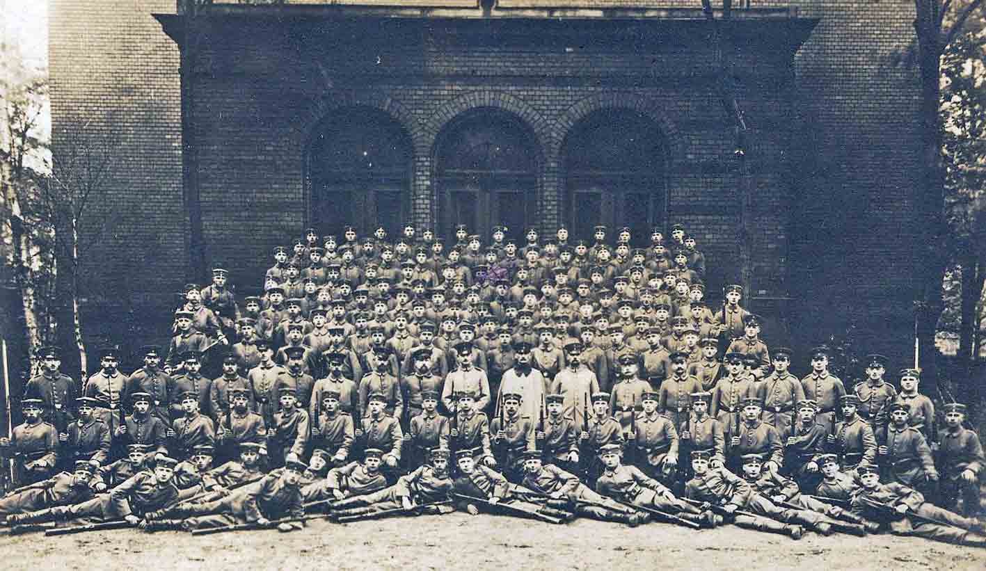 Viele der Gruppenbilder aus dem 1. Weltkrieg (außen junge Soldaten und in der Mitte Unteroffiziere) stammen aus solchen Rekrutendepots. Hier ein Kompagnie-Bild aus Altona mit Offizieren, Unteroffizieren und Mannschaften.