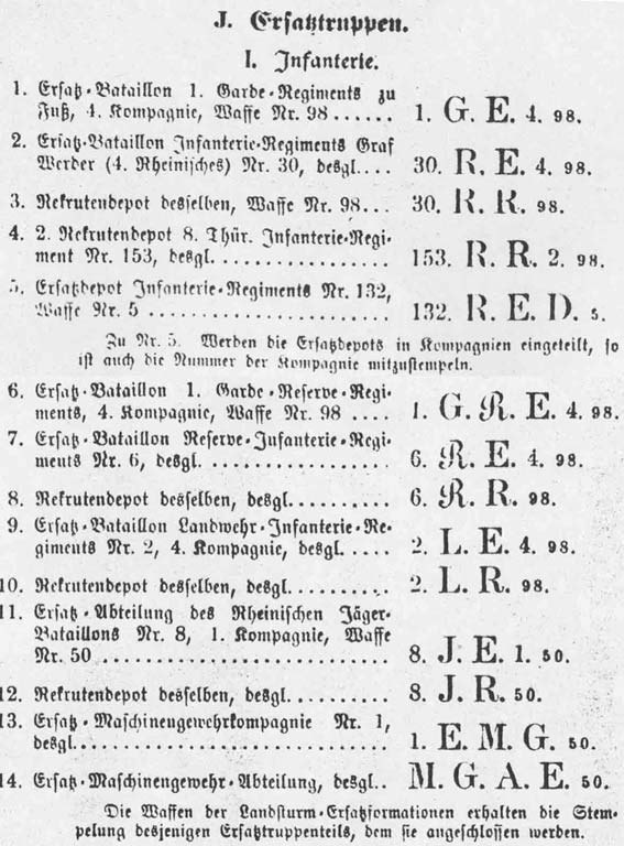 erst bei der Mobilmachung aufgestellt wurden und die Ausbildung der Rekruten während des Krieges für die aktiven Truppenteile vornahmen. Infanterieregimenter formierten ein Ersatzbataillon zu 4 Garde zu 5) Kompagnien, die Feldartillerieregiment eine Ersatzabteilung zu 2 fahrenden sowie einer reitenden Ersatzbatterie, die Fußartillerieregiment 2 Ersatzkompagnien, sowie alle drei dieser Formationen zusätzlich Handwerkerabteilung. Bei der Kavallerie bleibt eine Eskadron als Ersatzeskadron zurück.