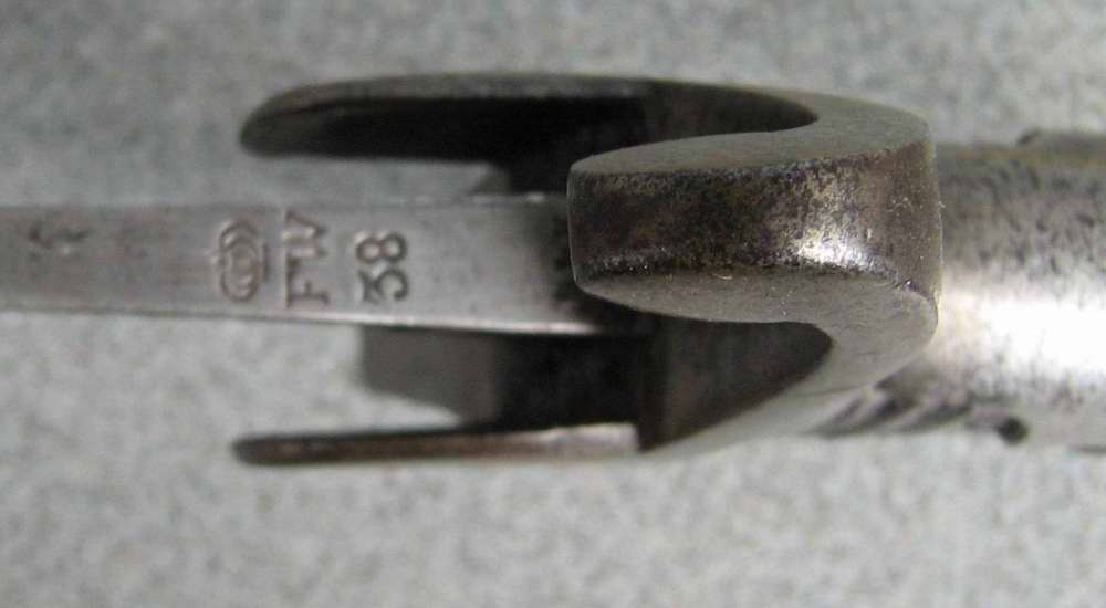 Schleppblech und Klingenrücken sind mit einem überkröntem FW und darunter eine 38 gestempelt. Auf der Pariestange erkenne ich noch "2 E 27 Lw R" und darunter eventuell eine 4.