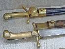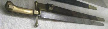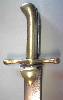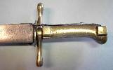 Dreiteiliges, gegossenes Messinggefäß bestehend aus Griff mit zwei Hakenösen, gerader Parierstange mit verdickten Enden und zum Ort hin abgebogenem Stichblatt. Auf dem Griffrücken verschraubt die Arretierfeder mit Drücker. Gerade Rückenklinge mit Sitze in der Klingenmitte.