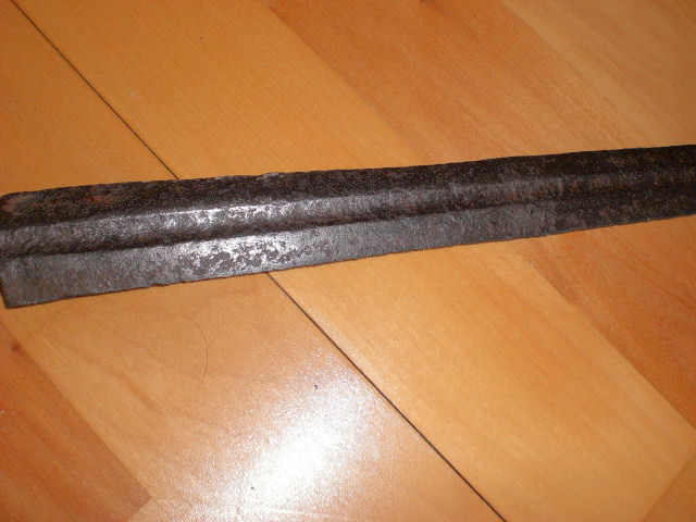 Hallo Thomas,die beidseitige Möglichkeit für eine Inschrift bietet sich auf einer Länge von jeweils ca.23 cm.Beide Seiten sind offensichtl. beschrieben,aber nur eine gibt etwas von IHREM Geheimnis preis,ohne Garantie auf Richtigkeit." MEL..TT......TOW...".Leider, hat der Rost schon zu viel Substanz vernichtet.Man glaubt, jetzt ist ein weiterer Buchstabe sichtbar,aber beim weiteren HINSEHEN ergibt sich doch keine..wirkliche.. Lösung.Fachleute mit der nötigen Kenntnis,haben event.den ALLES ENTSCHEIDENDEN BLICK dafür.Welchem Zweck, diente das kleine Loch im Knauf,war dort eine Markierung eingelegt,oder war ein Stift mit der Angel verbunden,zwecks weiterer Befestigung,denn der Knauf ist ja schon vernietet.Gruß,Sonjar