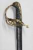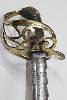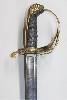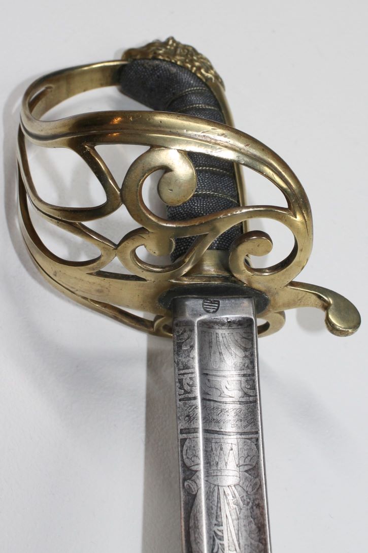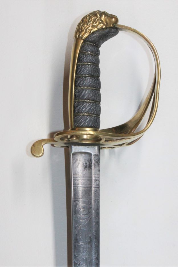 Das Stichblatt hat eine nach unten gebogene Parierstange mit Endknopf. Der gerippte Griff ist mit hellbrauner Fischhaut beledert und mit Kupferdraht belegt. Er hat eine ganze Kappe mit Löwenkopf und unten den Griffring mit kleiner Öse für das Portepee. Die volle Steckrückenklinge hat eine Spitze mit Schör und ist poliert. Sie trägt im oberen Drittel beiderseits Ätzungen, nämlich auf der Terzseite einen unklaren gekrönten Anker, auf der Quartseite die gravierte Widmung