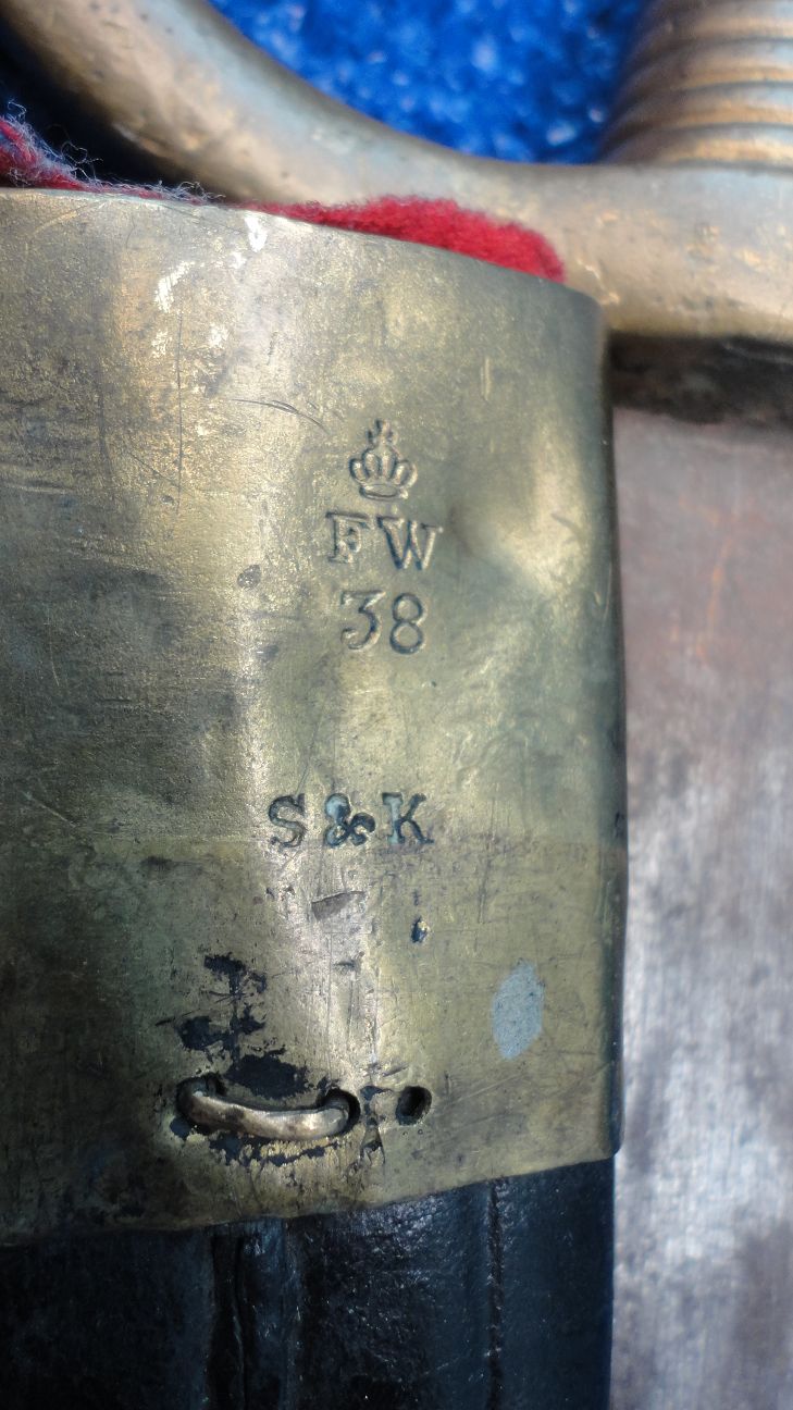 Scheide bis auf den abgebrochenen Tragehaken und dem ergänzten Ortblech noch ganz brauchbar.