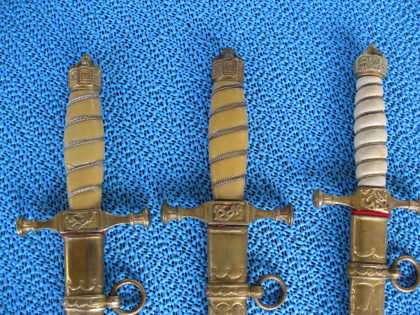 Die Griffstücke bei den "Schülerdolchen" bestehen aus Celluloid mit Holzkern.