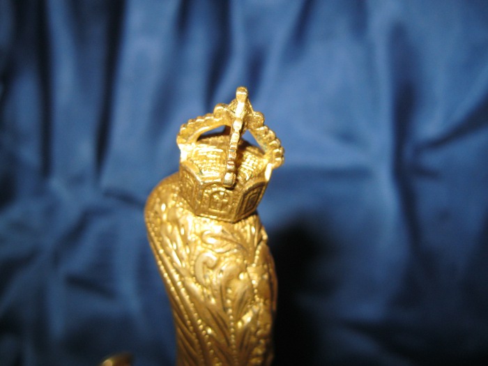 Mund.- und Ortblech weisen ein leichtes Hammerschlagdekor auf. Zudem sind die Scheidenbeschläge mit einem Eichenlaubdekor verziert.