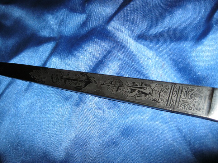 Die recht kräftige Keilklinge weist ein etwas abweichendes Ätzdekor auf. Das Stück hat keinen Hersteller.