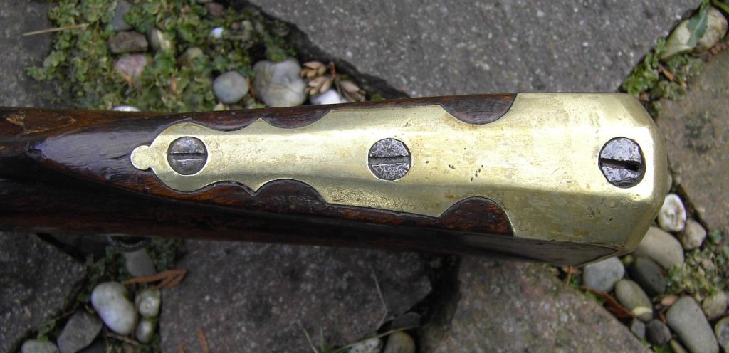 rautenförmigen Verschneidungen. Messingbeschläge bestehend aus Mündungsblech am Vorderschaft, drei kantigen, aufgetrichterten Ladestockröhrchen, wobei bei den beiden ersten Röhrchen der Trichter jeweils zur Hälfte abgefeilt wurde, einteiligem Abzugsbügel mit Verlängerung nach hinten und vorne, Kolbenblech mit ausgeprägter Nase für drei Schrauben auf der Kolbenoberseite, schlangenförmigem Schlossgegenblech mit abgeschrägten Kanten und drei Schrauben sowie Daumenblech mit Herrscher-Chiffre auf dem Kolbenhals. Flaches Steinschloss entsprechend dem Muster 1731 mit flachem Schloßblech, abgeschrägten Kanten und ebensolchem Schwanenhalshahn; eckige Eisenpfanne ohne Verbindung zur Batterie; Batteriefeder von der Schlossinnenseite her verschraubt. Eiserne Sattelstange mit eisernem Ring um Lauf und Schaft und Fixierung an der hinteren Schlossschraube, diese mit vorgeschriebenem Rundkopf; der Sattelstangenring fehlt. Kimme in das Schwanzschraubenblatt eingefeilt, Messing-Ovalkorn auf dem Lauf. Auf der gesamten Länge runder Lauf mit zwei Kanellierungen am Pulversack. Lauf/Schaftverbindung durch Kreuzschraube, Sattelstangen-Laufring und vordere Riemenöse.