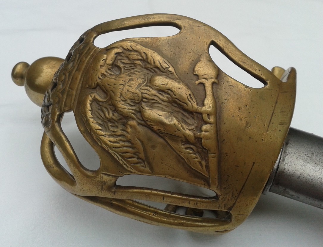 Preuß. Kürassierdegen (Mannschaft, sog. „M. 1732“, also frühe Adlerform mit kleiner Chiffre „FR“, Gefäß mit Kupfer zusammengelötet, Datierung zwischen 1740 und 42). Gefäß unten mit gravierter Nr. und drei Punkten (Montagemarkierung ?) versehen. Klinge bikonvex, ohne erkennbare Marken, mit Reißhaken, Länge 92, 7 cm.