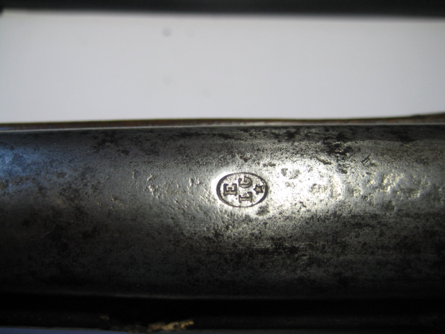 Gesamtlänge: 121cm . Da die zwei vorderen Laufringe sehr nah beieinander sind und eine Bajonettwarze nicht vorhanden ist, denke ich das dieses Gewehr gekürzt wurde. Auf den Laufringen sind Stempel eingeschlagen, welche ich als "P" deute. Auf der Laufoberseite befindet sich eine Marke mit den Buchstaben E - L - G mit einem Stern.