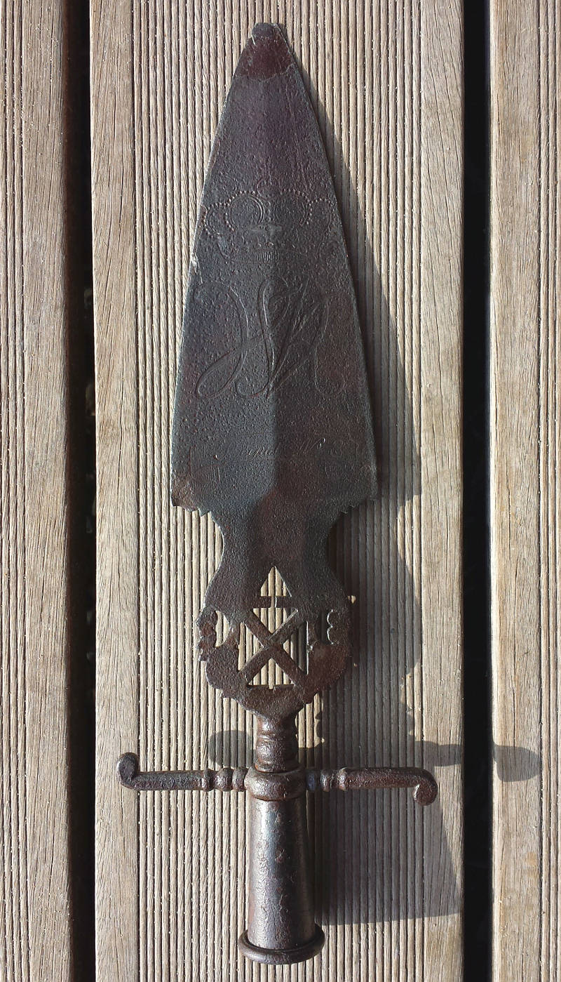Dieses Sponton zeigt auf dem Blatt das Signet "WK" unter Kurhut und in einer Banderole "Regmt N