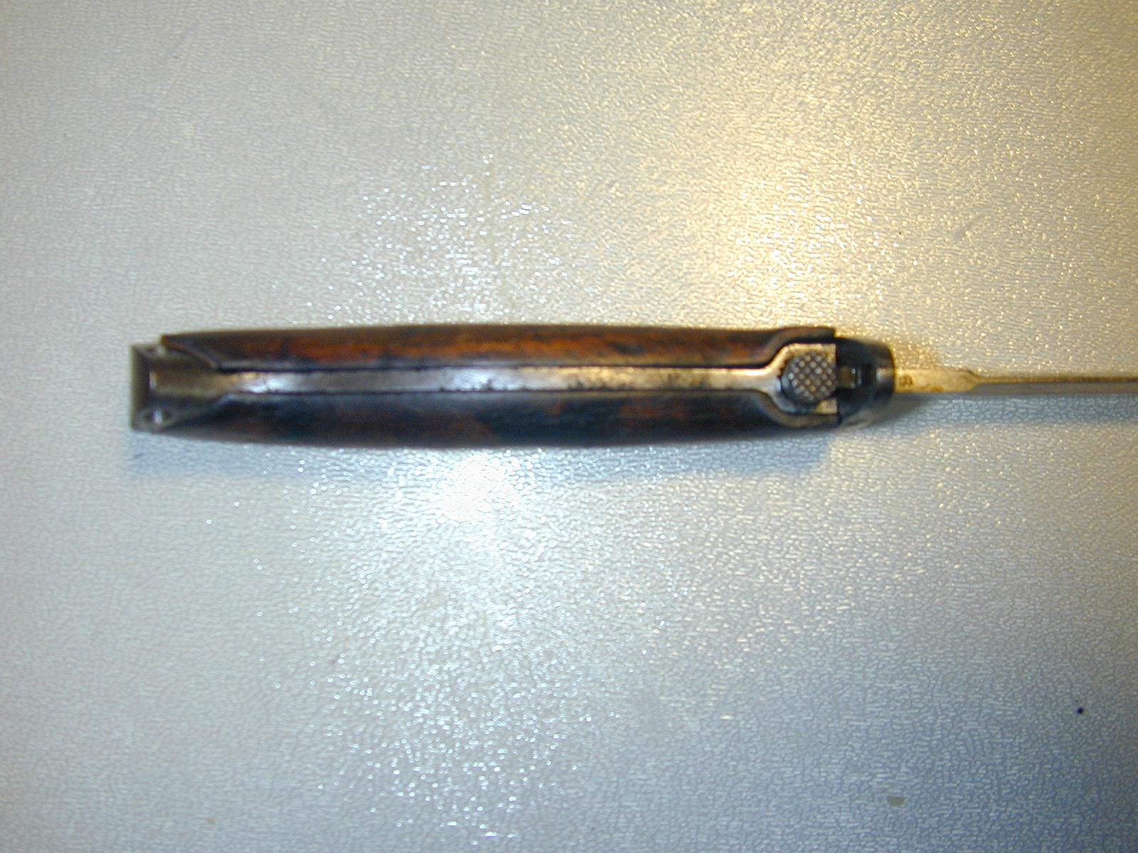 Der Drücker, über der Parierstange zu sehen, wirkt gegen Federdruck auf einen