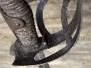 Das Stück ist in einem kräftig gebrauchtem Zustand, insbesondere das Gefäß wurde wohl mechanisch entrostet, wobei die vormalige Vernickelung zu 99% entfernt wurde; es finden sich noch leichte Rückstande in der Umgebung der Grifflappennieten. Markierungen zeigen sich keine, weder auf Klinge noch auf Gefäß.