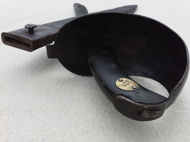 Das Gefäß hat eine recht große Parierplatte und geht in einen breiten, und dann schmaler werdenden Handbügel über.