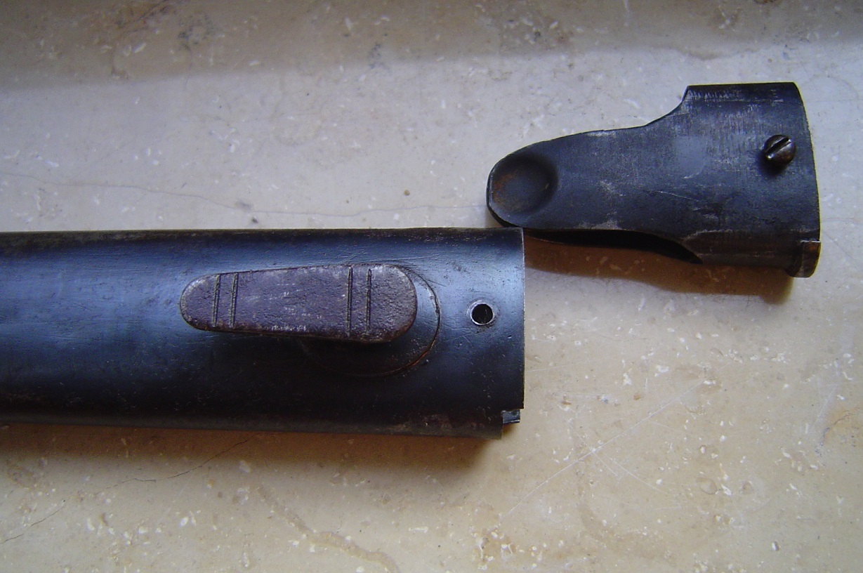 Die Scheide weißt diverse Auffälligkeiten auf! Der Mundblecheinsatz hat keine Plattfedern, die würden in den schmalen, schlanken Scheidenkörper auch nicht rein passen. Es sind 2 Löcher zur Befestigung des Mundbleches vorhanden, der Einsatz hat jedoch nur ein Loch! Am Tragehacken ist schwach eine Abnahme zu erkennen. Truppenstempel ist hier M.G.A.3.13 Maschinen Gewehr Abteilung 3 in Saarburg.
