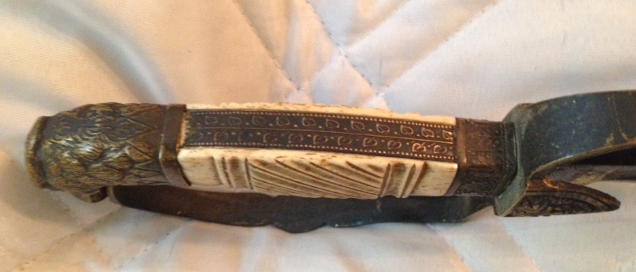 Gerade Klinge, Elfenbein Griffplatten, Scheide aus Messing mit Silber.