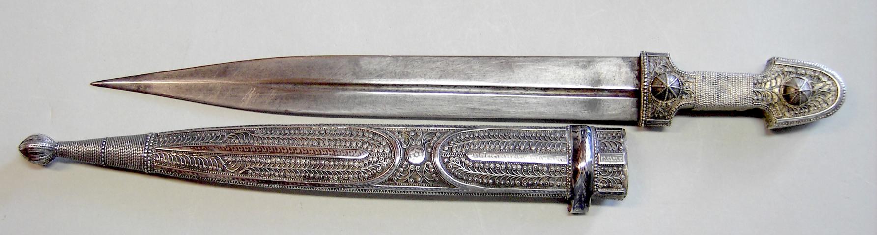 Ich besitze seit längerem diese Blankwaffe, die im allgemeinen als Kindjal bezeichnet wird. Das Stück trägt an der Scheidenrückseite den Namen "Aksenti Peradze", wobei das "Peradze" ein in Georgien sehr häufig anzutreffender Familienname ist, so dass man annehmen kann, dass die Waffe wohl von dort stammt. Gefertigt wurde das Stück mit großer Wahrscheinlichkeit in Tiflis.