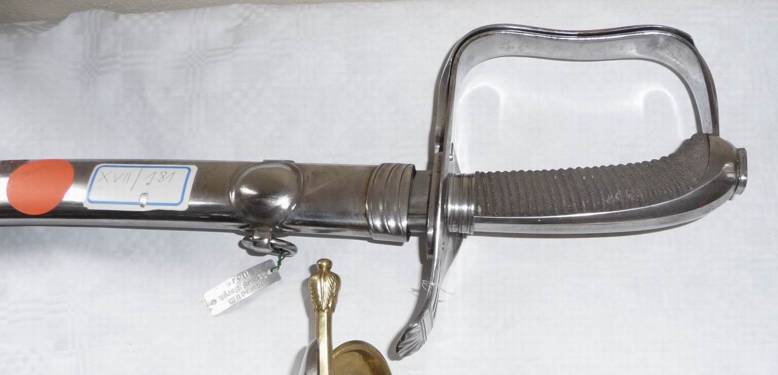 Säbel für Stabsoffiziere der österreichischen leichten Kavallerie M1827/37 (nach Moudry "Chladné zbraně : šavle habsburské monarchie 16.-20. století "). Gefäß mit klappbarem Nebenbügel. Goldene Verzierungen auf Echtdamastklinge.