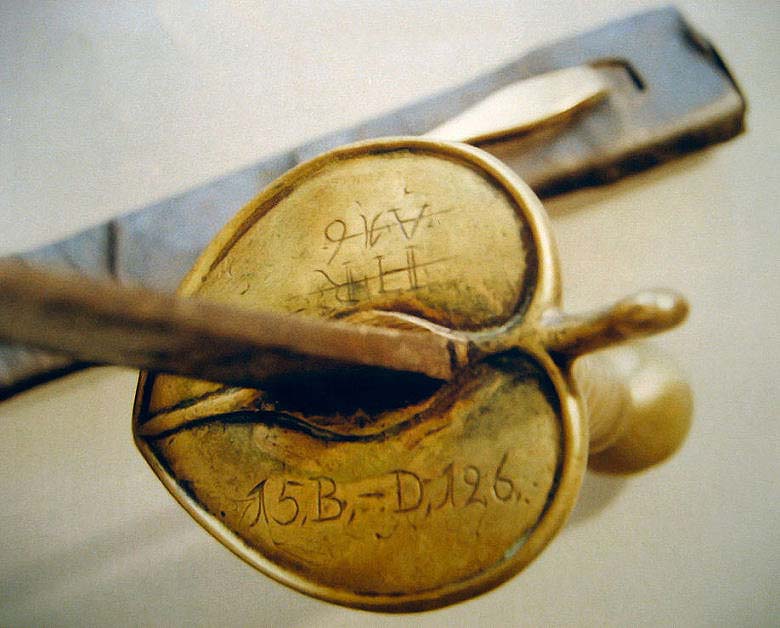 Ein weiterer "Fußvolksäbel". Auf dem Parierstangenendknopf Stempel "B6C". 2. Foto: Stichblattunterseite (Fotos: Felsen).