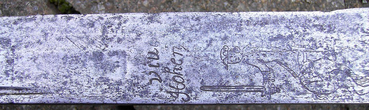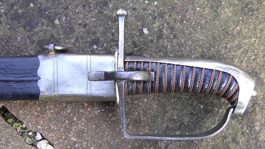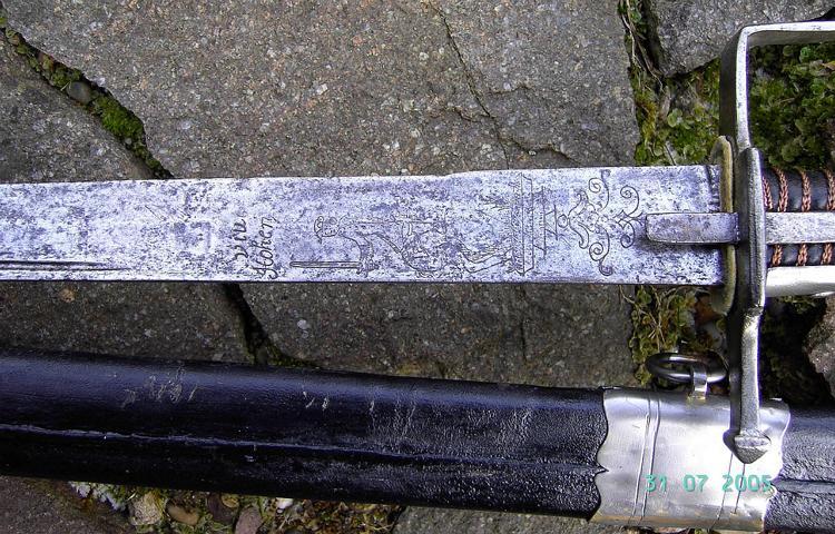 Der Pallasch hatte ursprünglich einen muschelförmigen Handschutz, welcher entfernt wurde. Gesamtlänge 965mm, Klingenlänge 830mm, Klingenbreite 37mm, Am Ort im Rücken ein "Reißhaken". An beiden Klingenseiten das nur noch partiell lesbare Motto "VIVAT HOHENZOLLERN"