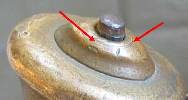 Zum Klappern des Griffs: Meines Erachtens wurde der Niet derart geöffnet, indem man mit etwas Gewalt die Griffkappe Richtung Klinge schob (die Hilze gibt dabei einige wenige Millimeter nach), bis der Nietkopf sichtbar wurde. Dann wurde wohl der seitlich überstehende Rand der Vernietung, welcher die Teile letztendlich zusammenhält, abgefeilt. Dabei scheinen die kreisrunden Riefen auf der Griffkappe entstanden zu sein, welche ich in der unteren ersteren Abbildung durch rote Pfeile verdeutlicht habe.