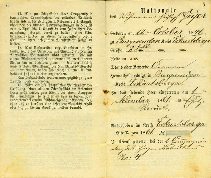 Hier nun als "Dublicat" der Militär-Paß des 1841 in Burgwenden geborenen Christoph Geyer. Deutlich wird hier auch seine Verwendung beim Magdeburgischen Jäger-Bataillon Nr. 4 bis hin zu Landwehr.