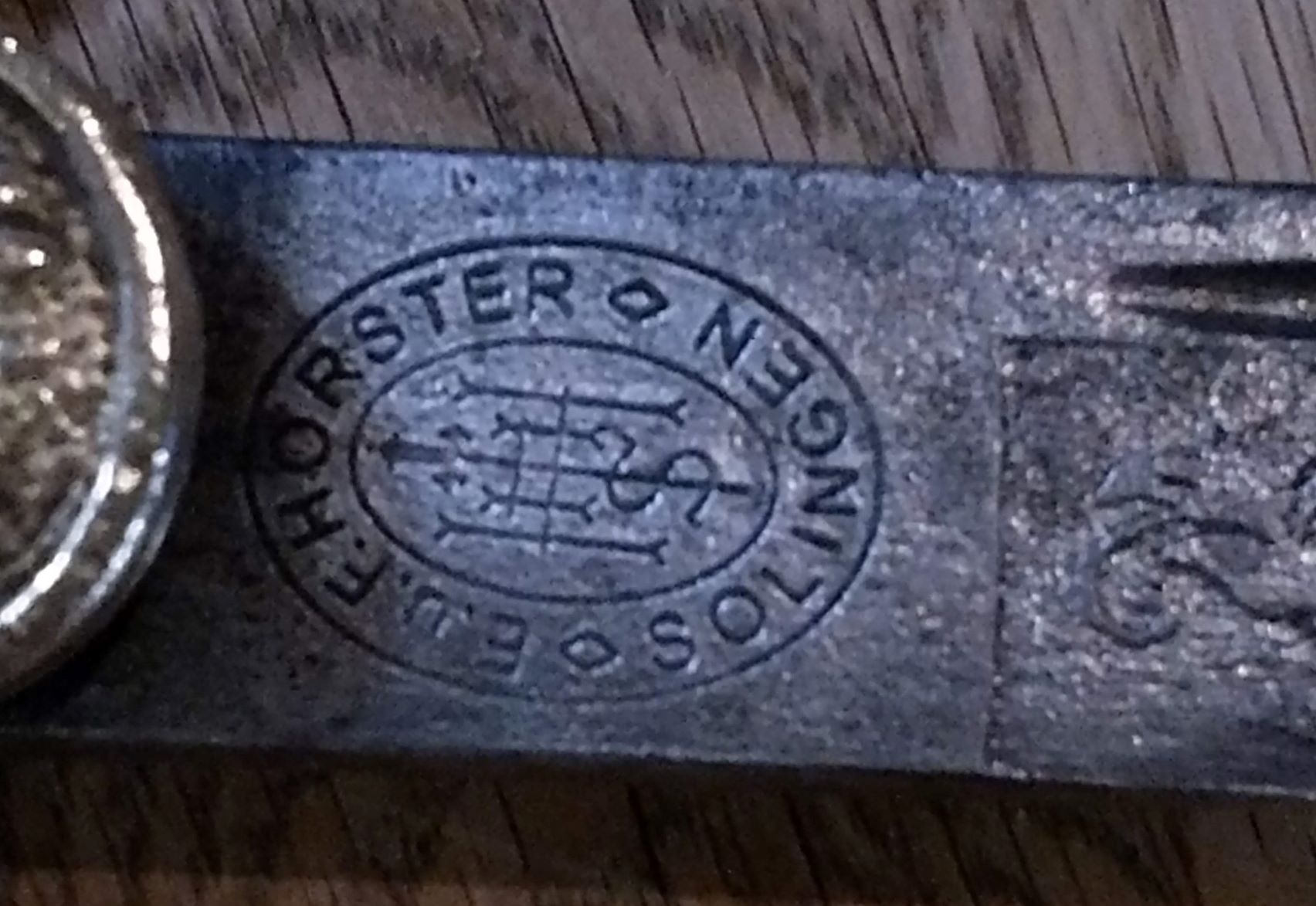 Die Klinge sitzt nicht mittig im Gefäß. Das Herstellungszeichen der Fa. Hörster stammt eher aus der Zeit der Reichswehr bzw. der frühen Wehrmacht…..